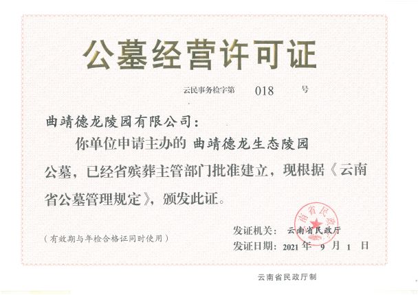 曲靖德龍陵園有限公司于2015年3月26日成立,注冊(cè)資金1160萬元,系曲靖市紅十字會(huì)團(tuán)體會(huì)員單位。公司經(jīng)營(yíng)范圍:殯葬設(shè)施經(jīng)營(yíng);殯儀用品銷售;殯葬服務(wù);禮品花卉銷售;休閑觀光活動(dòng)。